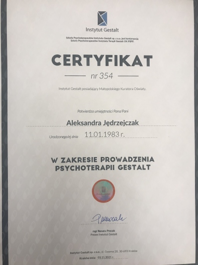 Jestem certyfikowaną psychoterapeutką i obecnie prowadzę psychoterapię indywidualną dla dorosłych w ramach prywatnej praktyki. Ukończyłam 4-letnią szkołę psychoterapeutyczną w Instytucie Terapii Gestalt w Krakowie.